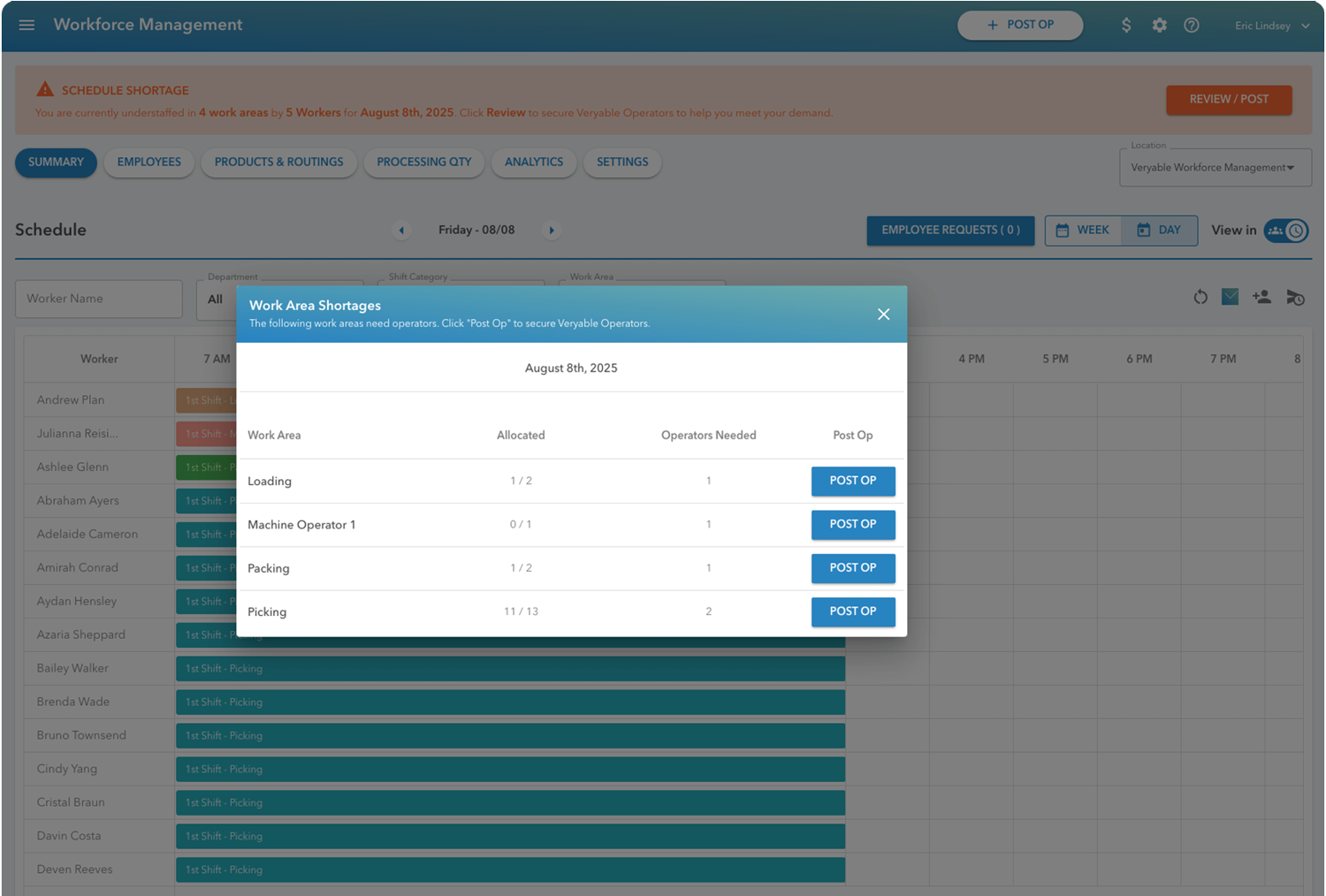 Veryable’s WFM Platform brings all your labor information into one easy-to-use system. It integrates data from ERP, WMS, MES, HRIS, and other operational tools to give you real-time visibility into schedules, labor needs, and team performance. Automated scheduling ensures the right number of people are assigned to the right shifts and tasks, while giving employees the ability to view schedules, swap shifts, and manage time-off requests seamlessly. Real-time dashboards track throughput, labor cost per unit, and productivity—helping you make informed, on-the-floor decisions that keep operations on track.